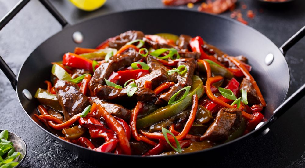 - Heat half of the oil in a wok or large pan on high heat. Add a small amount of the garlic then stir fry the kangaroo strips in two batches very quickly until the strips are just seared on the outside, remove and set aside.